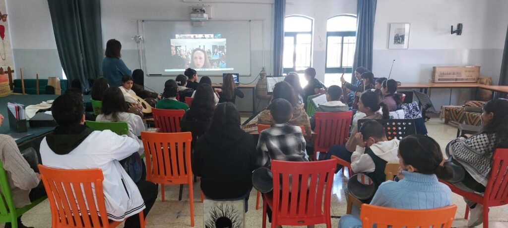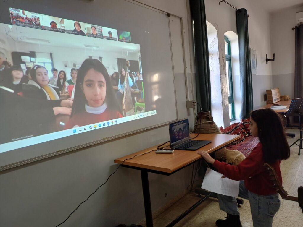 مركز غراس الثقافي – بيت لحم – فلسطين – الاثنين الموافق 26/1/2026- في إطار الجهود الرامية لتعزيز التشبيك الثقافي وتبادل الخبرات الفنية، عُقد مؤخراً لقاء تفاعلي دولي عبر تقنية الاتصال المرئي، جمع بين برنامج “براعم غراس للموسيقى”، ومركز “تجلى” في العاصمة الأردنية عمّان، ومؤسسة “سوكاجاكاي” الدولية في اليابان وهدف اللقاء إلى مد جسور التواصل بين الثقافات المختلفة، حيث استُهل بالتعريف بالمؤسسات المشاركة ورؤيتها الفنية. وفي كلمتها الافتتاحية، أكدت السيدة فابيان، مسؤولة برنامج “براعم غراس للموسيقى” (الذي ينفذ بالتعاون مع منظمة “موسيقيون بلا حدود”)، على الأهمية الاستراتيجية لبناء الشراكات الثقافية، مشيرةً إلى دور هذه المبادرات في توسيع مدارك الأطفال وتمكينهم من الانفتاح على تجارب موسيقية عالمية متنوعة. وشهدت الفعالية مشاركة لافتة من الجيل الجديد، حيث قدمت الطالبة دونا جبرية نبذة تعريفية عن برنامج “براعم غراس”، مستعرضةً الأثر الإيجابي للموسيقى على صقل شخصيتها وتطوير مهارات زملائها. وفي سياق إبراز الهوية الثقافية، قدمت لارا أبو غزالة شرحاً وافياً عن آلة “القانون”، متناولةً تاريخ نشأتها ومسلطةً الضوء على عمق وثراء التراث الموسيقي العربي. وتخلل اللقاء عرض مواد مرئية تضمنت مقطوعات موسيقية مميزة قدمتها الجهات المشاركة، عكست التنوع الفني والتقارب الإنساني. واختتمت الفعالية بجلسة نقاشية تفاعلية، طُرحت خلالها أسئلة عفوية من قبل الأطفال، مما عكس شغفهم الكبير بالتعلم وفضولهم المعرفي تجاه الثقافات الأخرى. وقد شكل هذا الحدث تجربة ملهمة تجاوزت حدود الجغرافيا، حيث نجح في ربط الموسيقى بالهوية الوطنية، وفتح نوافذ جديدة للأطفال نحو العالم، مرسخاً رسالة مفادها أن الإبداع هو لغة إنسانية موحدة لا تعترف بالحدود.